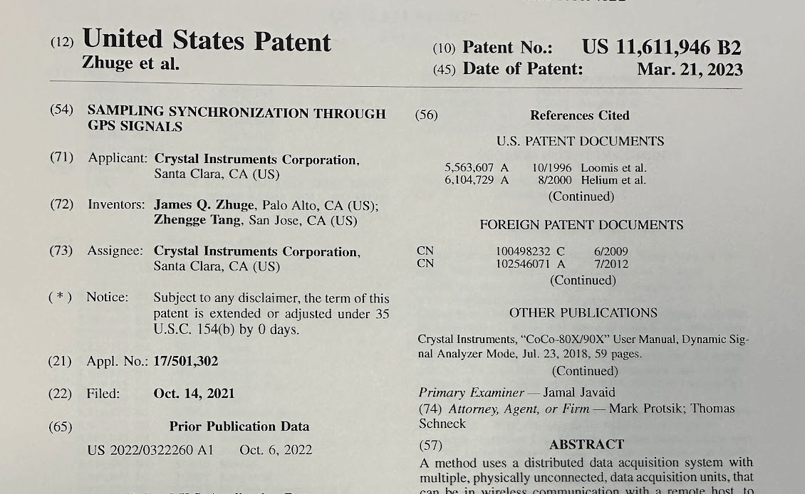 Crystal Instruments has recently been granted a patent (US 11,611,946) for the methodology used to synchronize signals acquired using multiple physically unconnected data acquisition systems.