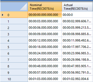 In the following table, the Nominal Time is the local clock time, and the Actual Time is derived from the GPS signals. Both times are associated with one acquired data set.