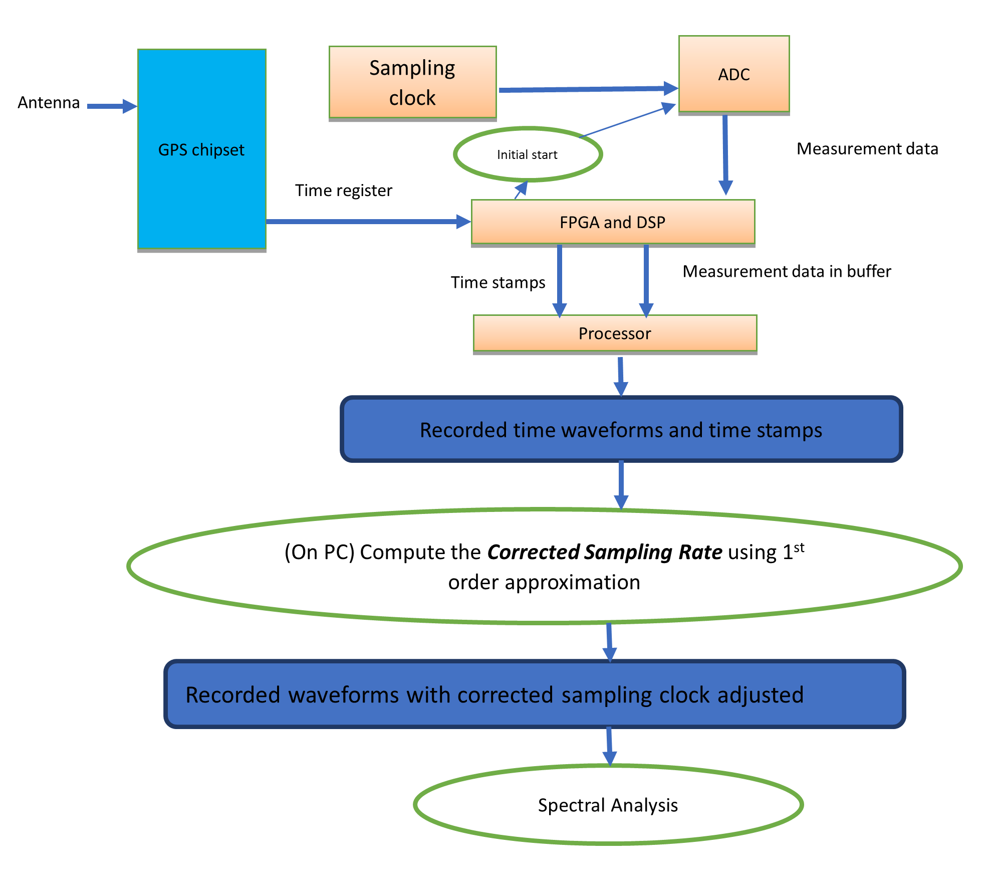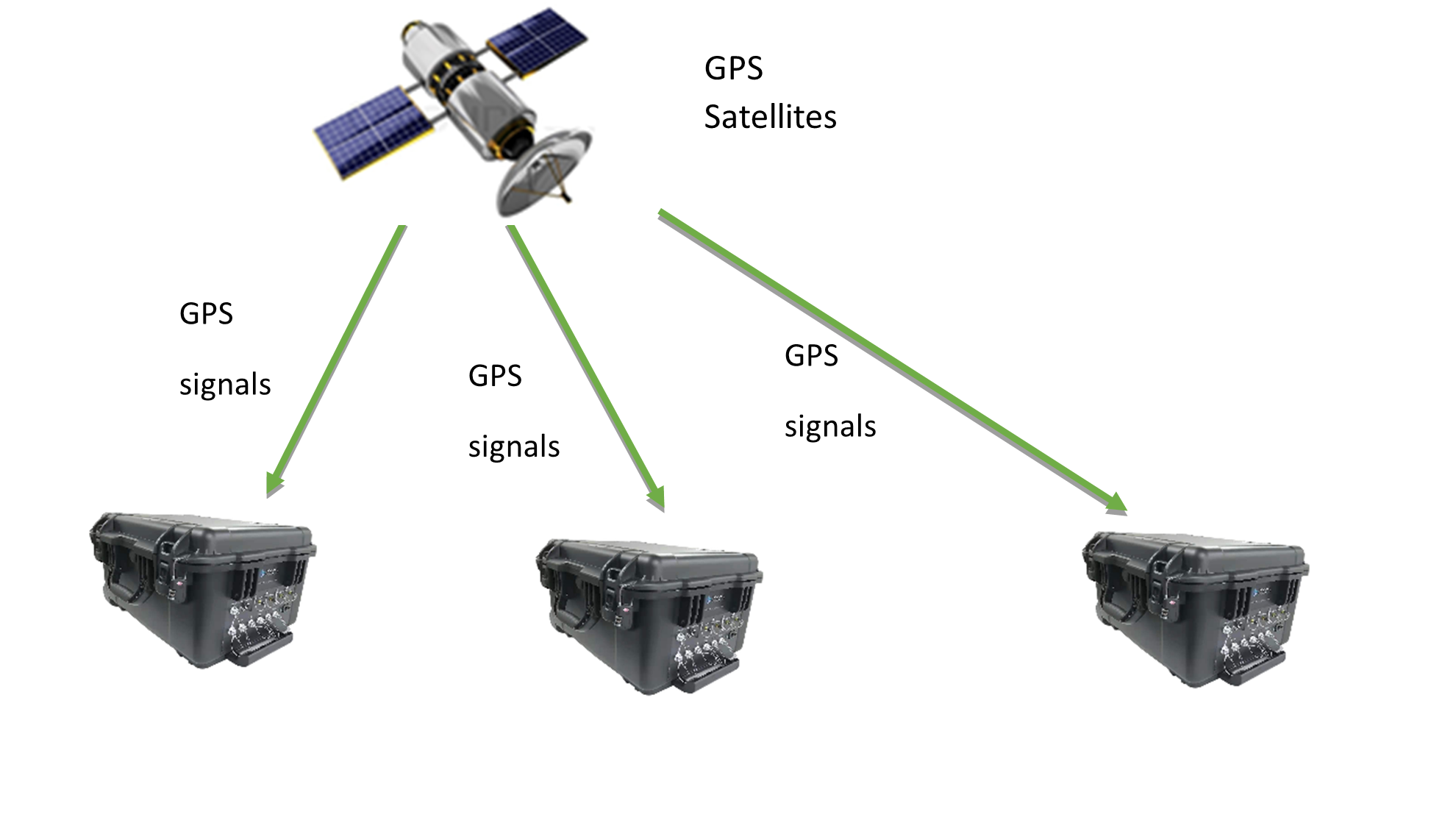 Multiple CI-GRS data acquisition systems can acquire data simultaneously while physically spread out over hundreds of miles, and each system’s ADC sampling clock may have a unique ADC clock offset. These units do not share any direct hardware connections, but each will receive GPS signals.