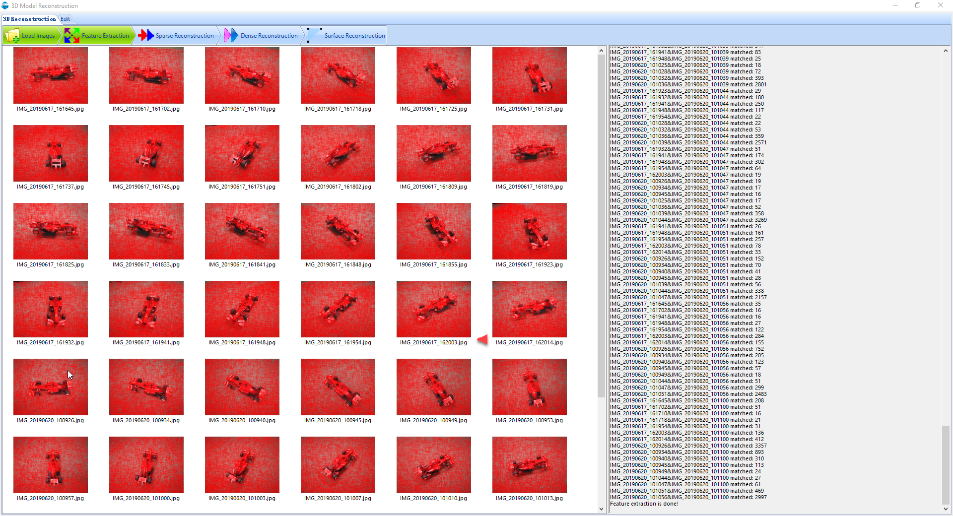 The 2D photos are imported into the reconstruction software to match the images and extract the features.