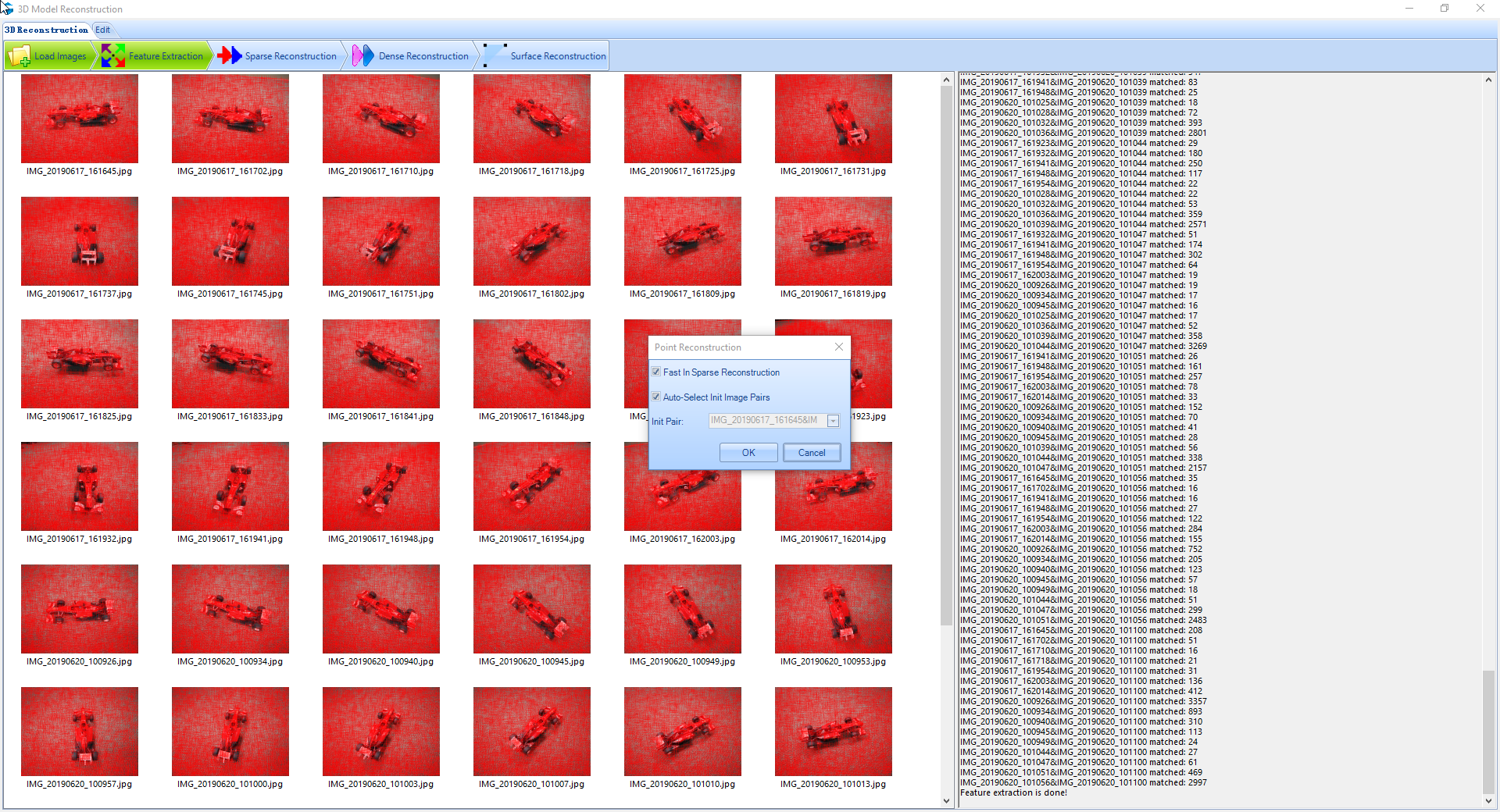 Detecting the key features from the images helps in creating a sparse point model of the test structure. This is a fast and rough model creation before the constructed point geometry is fine tuned in the dense point reconstruction procedure. The initial image pairs to begin the spare point model reconstruction can be automatically chosen by the software.
