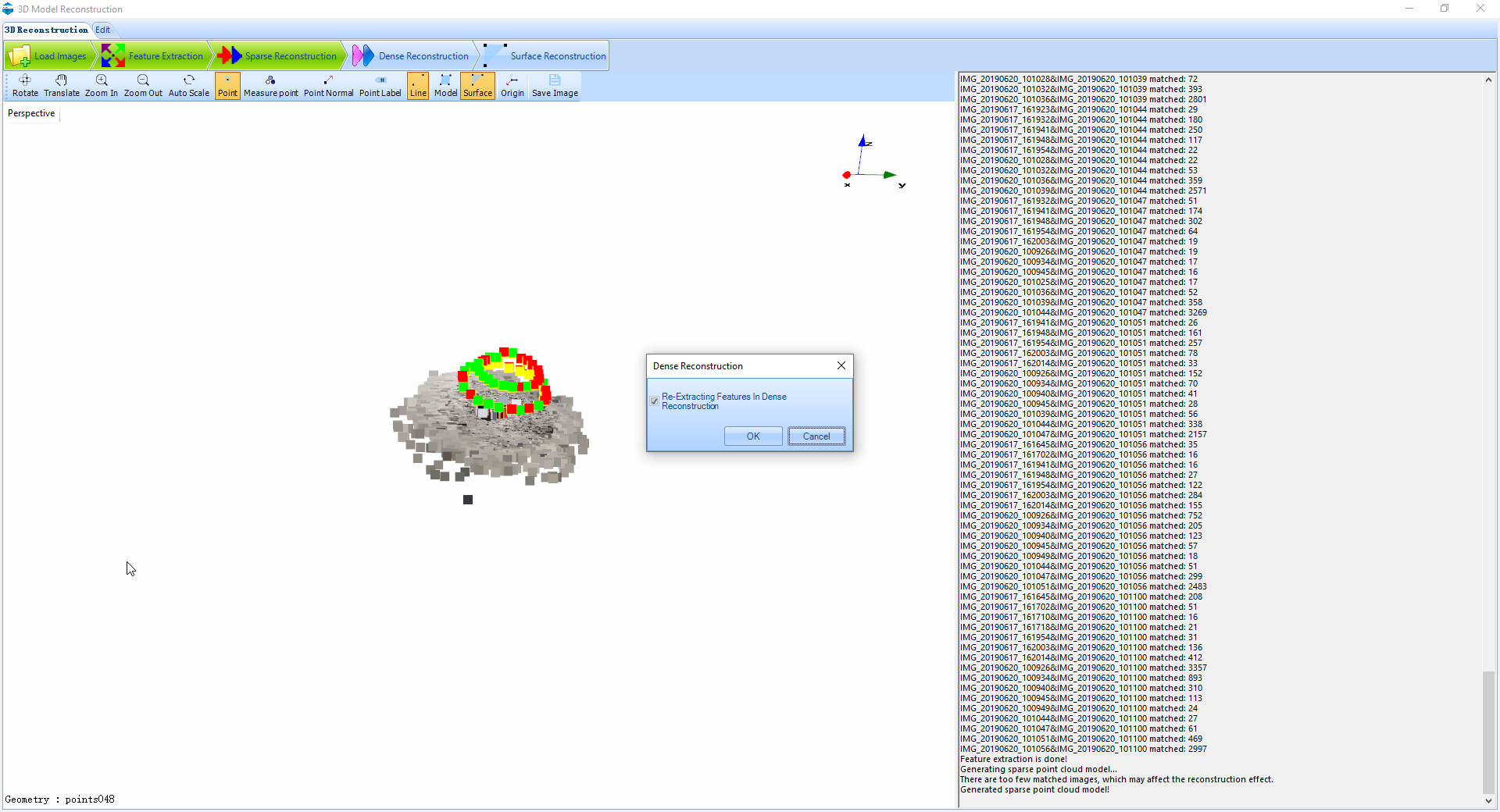 More information from the feature extraction and sparse point reconstruction is used to generate a dense point 3D model.